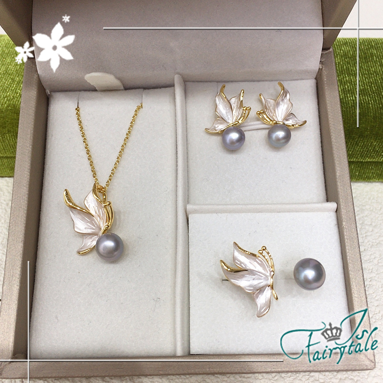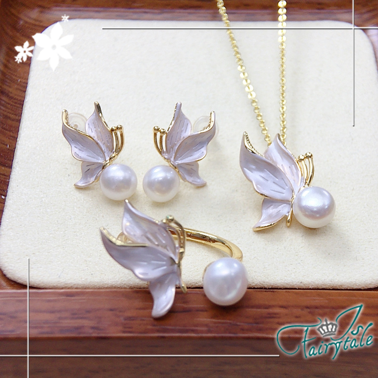 【伊飾童話】蝴蝶翩翩 天然珍珠項鍊耳環戒指灰色三件組