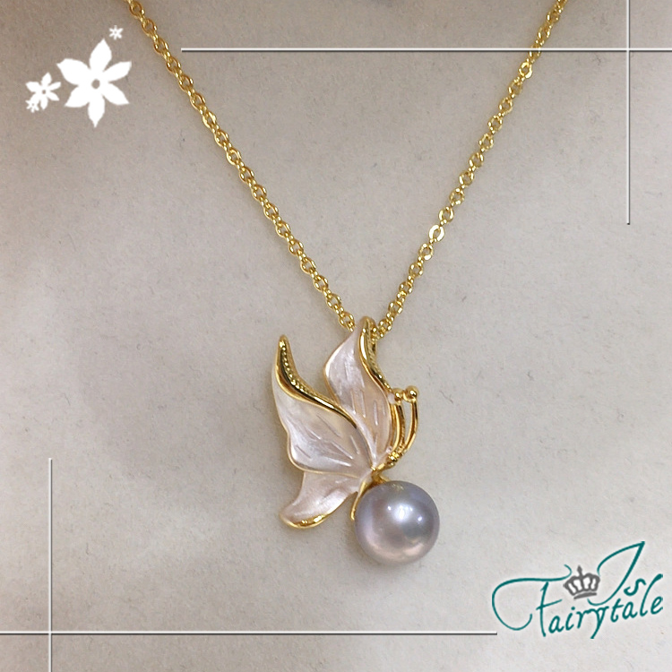 天然珍珠與磨砂蝴蝶的搭配,金鑌色澤飾品氣質出眾,