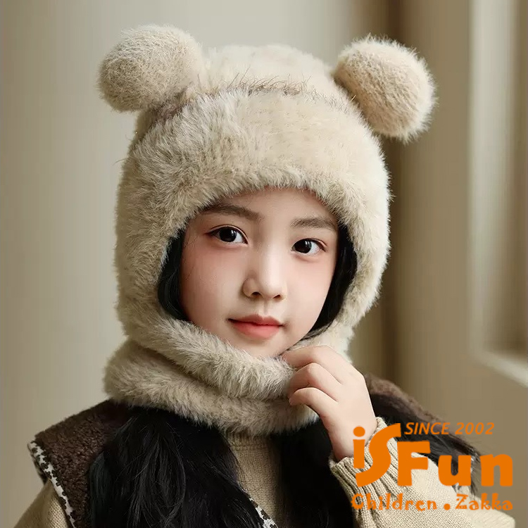 【iSFun】小熊耳朵 兒童秋冬毛絨針織圍巾一體帽/米色