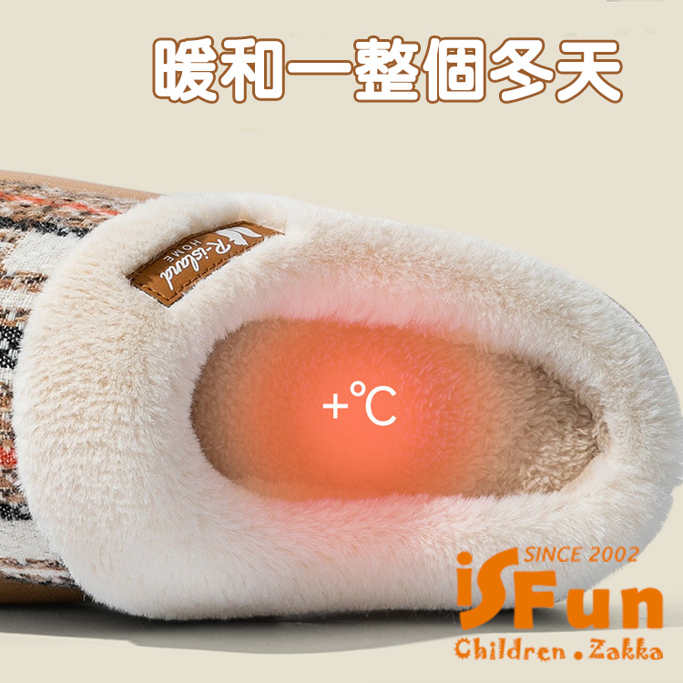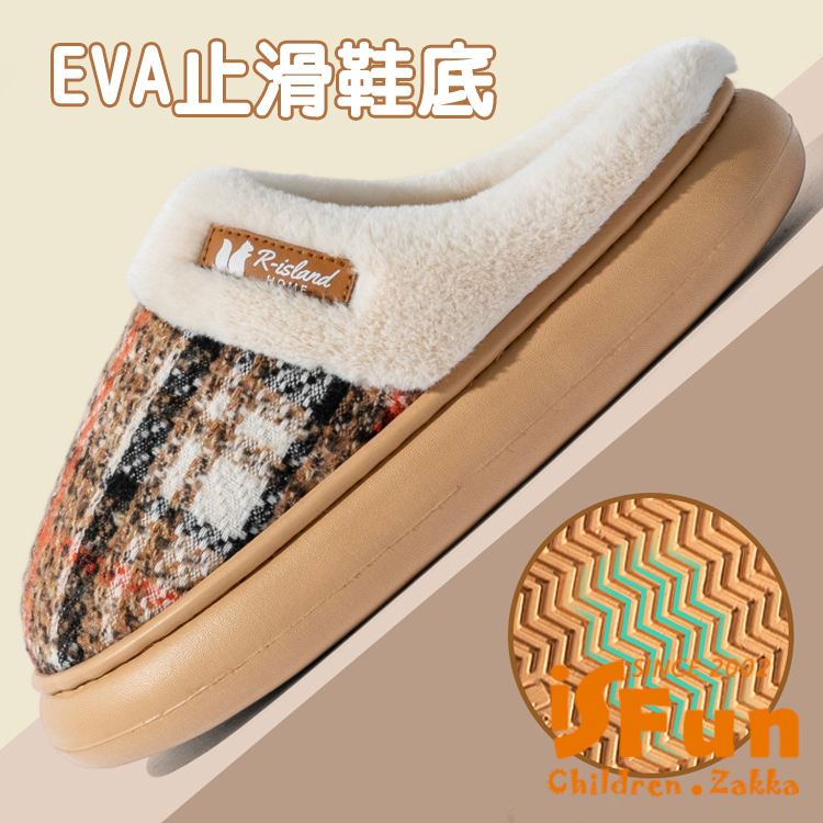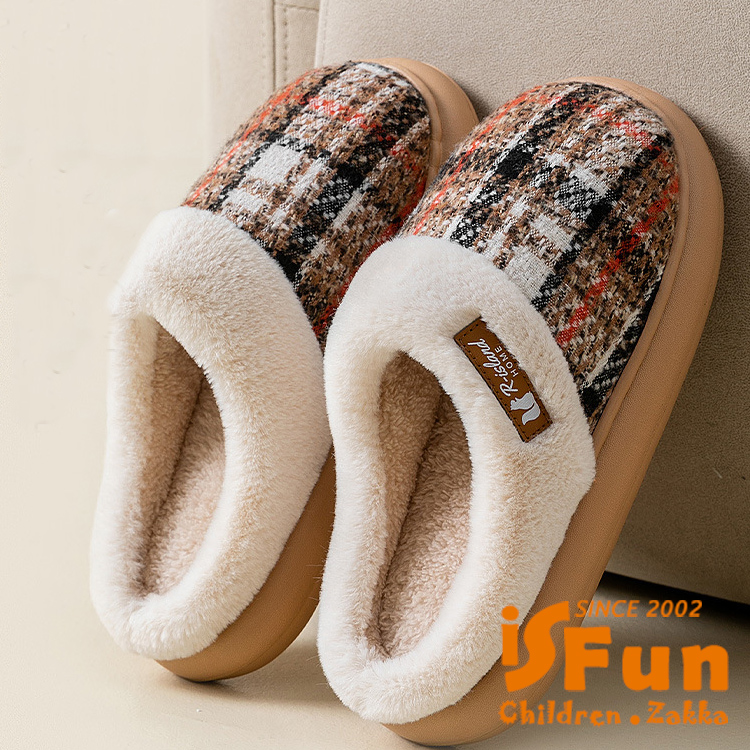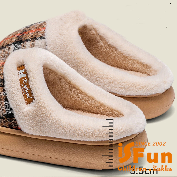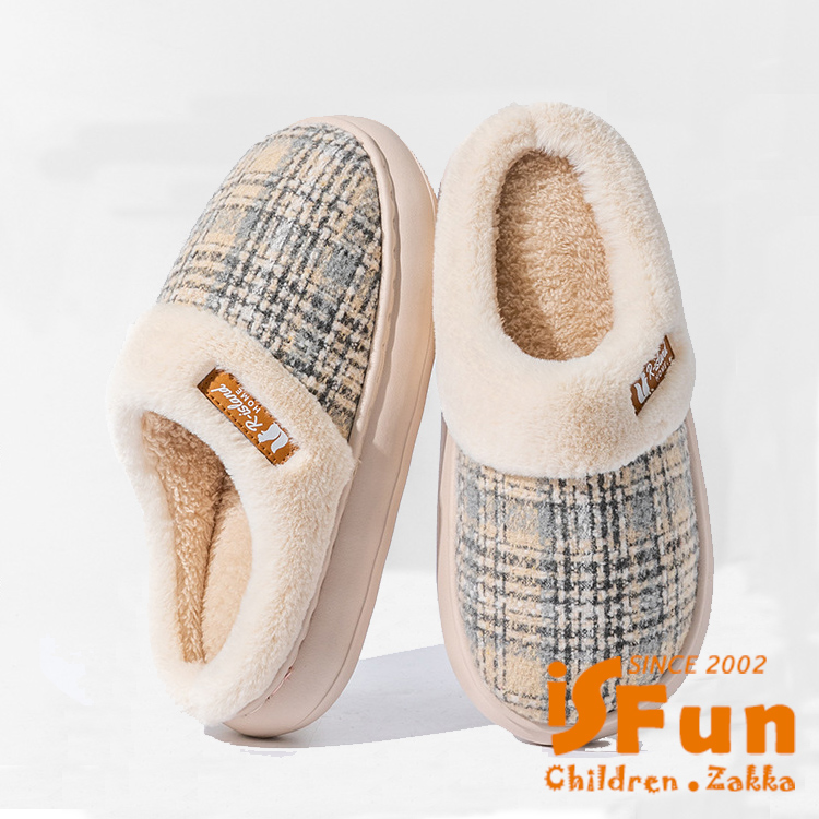 【iSFun】英倫格紋 厚底防滑男女室內刷毛拖鞋/米色4041號