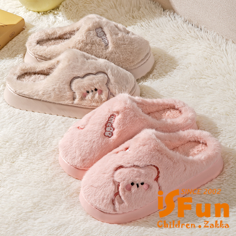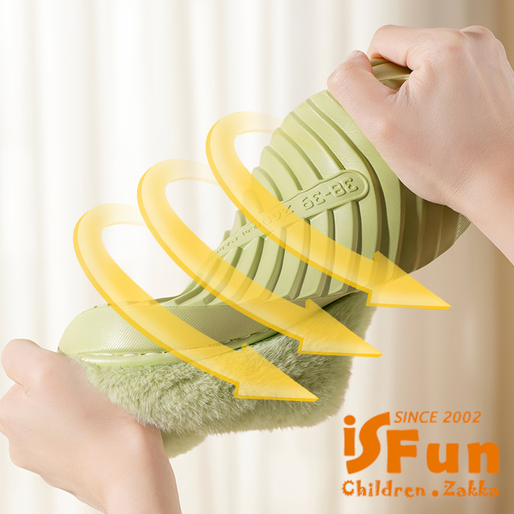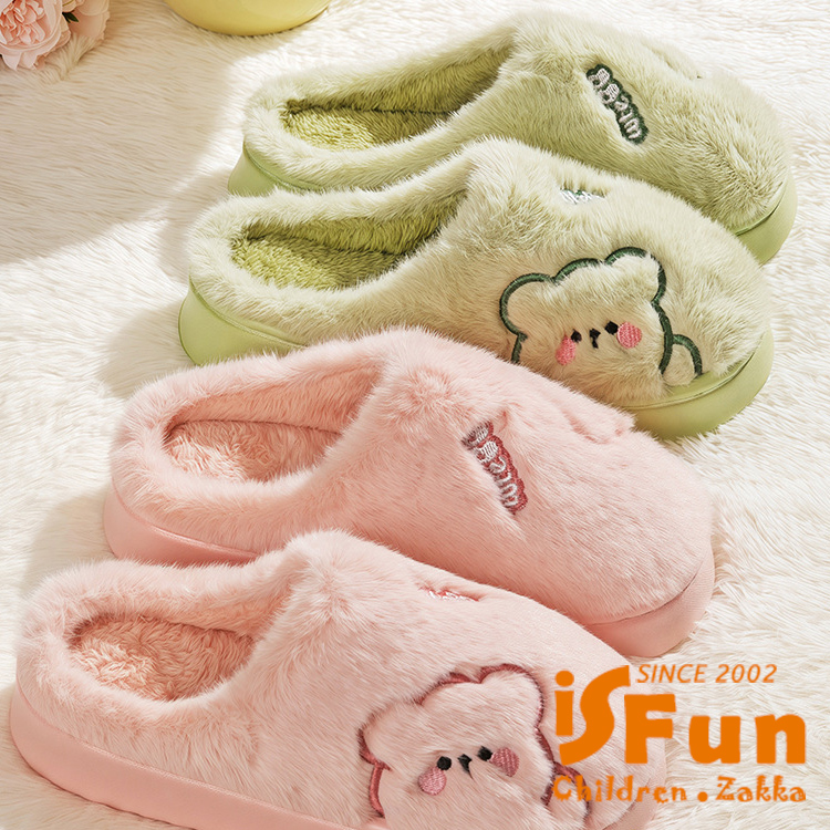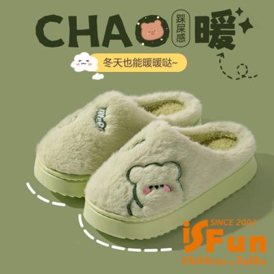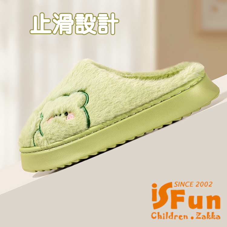 【iSFun】線條萌熊 厚底防滑保暖毛毛室內拖鞋/綠色3839號