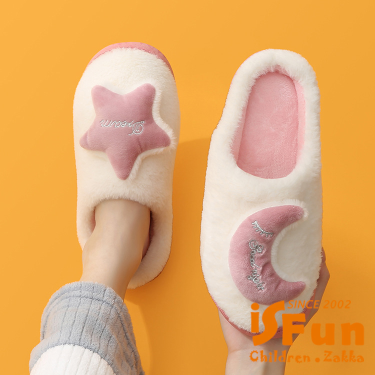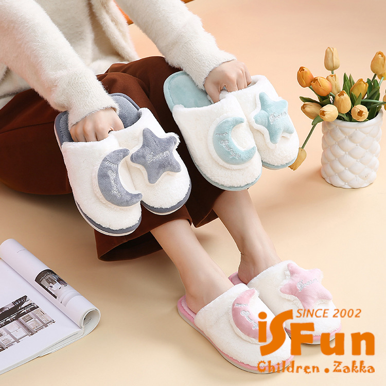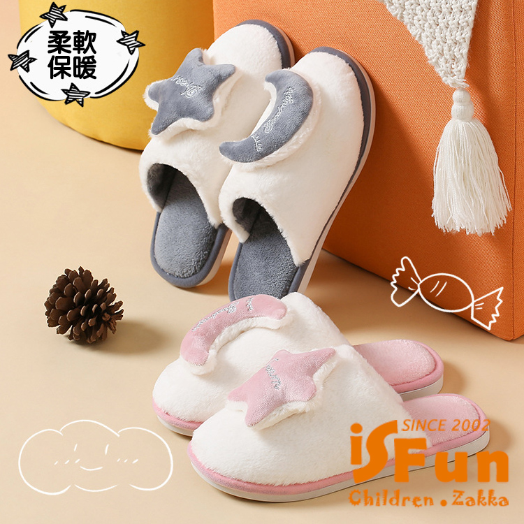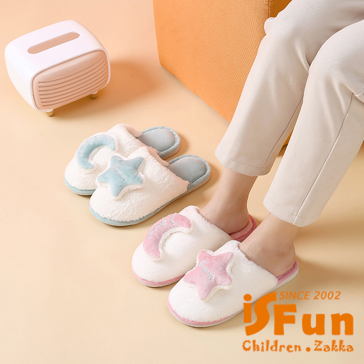【iSFun】雅致星月 秋冬厚底防滑毛毛室內拖鞋/3637號綠白