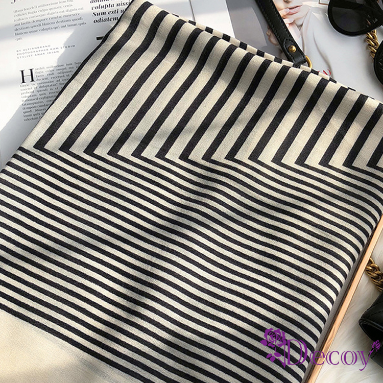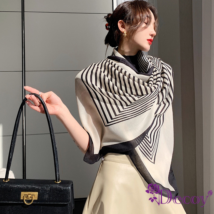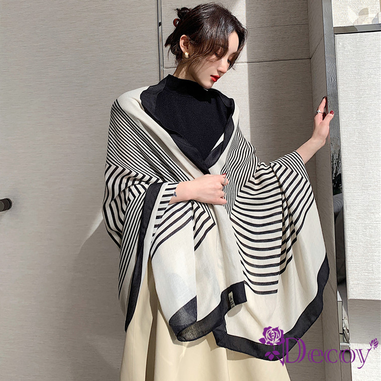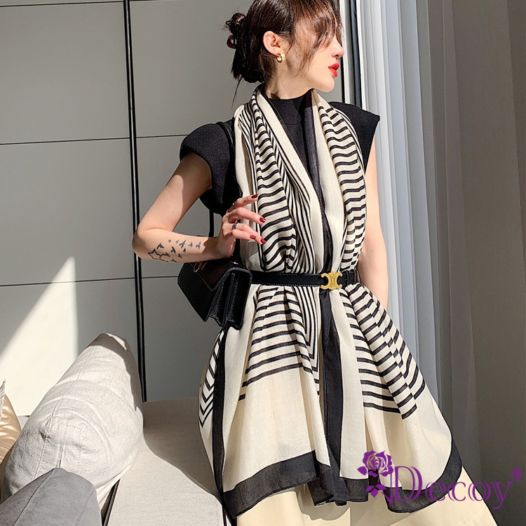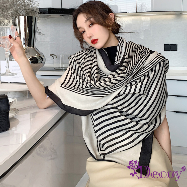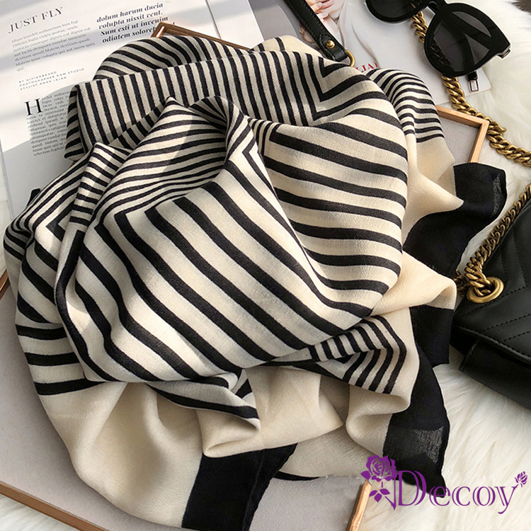 【Decoy】幾何條紋*黑白撞色棉麻春秋圍巾/白