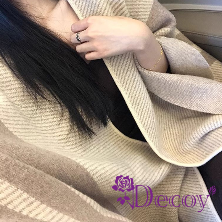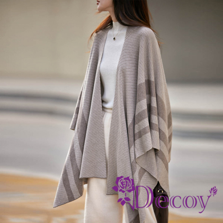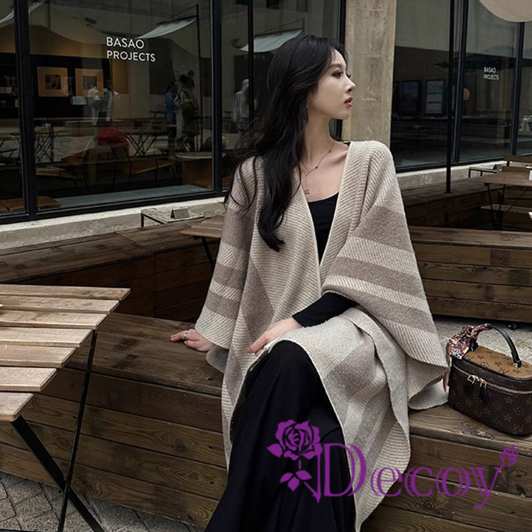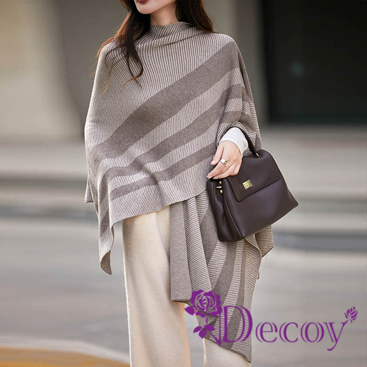 【Decoy】清新雅致 條紋加大保暖斗篷式披肩/奶茶色