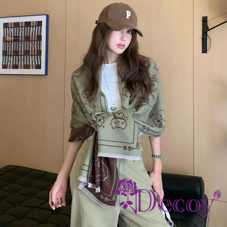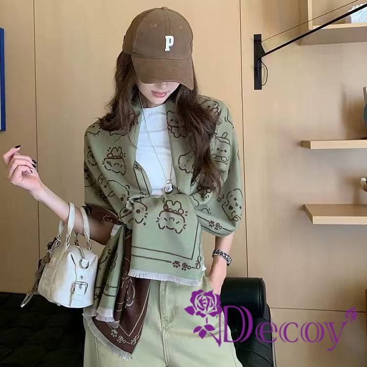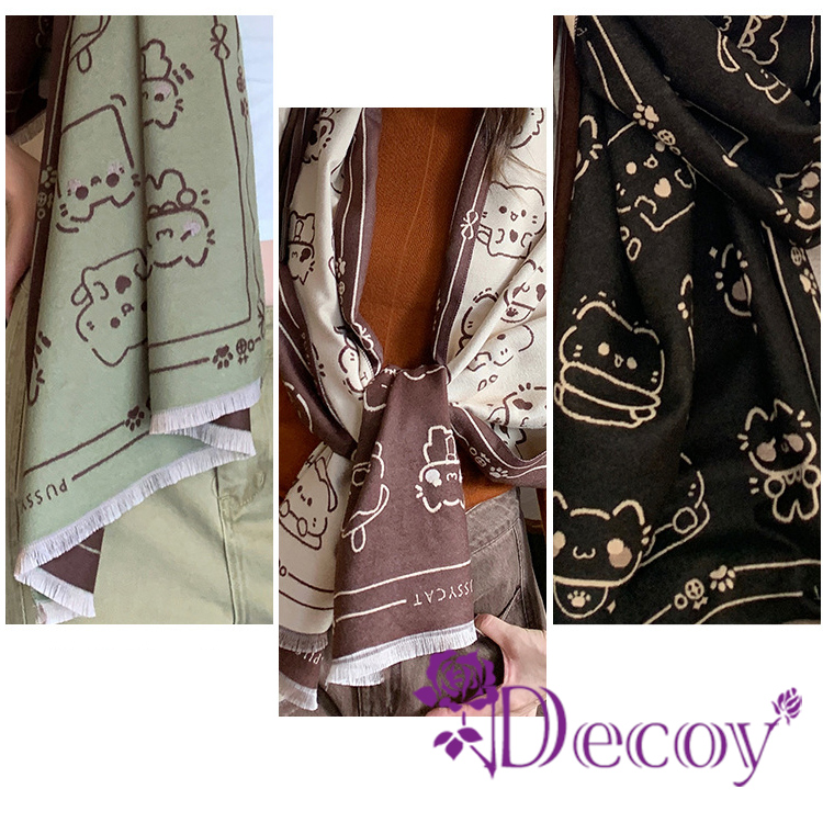 【Decoy】俏皮萌貓 雙面印花仿羊絨披肩圍巾/綠咖啡