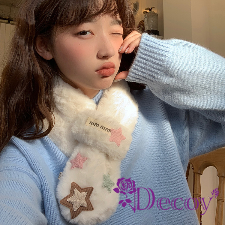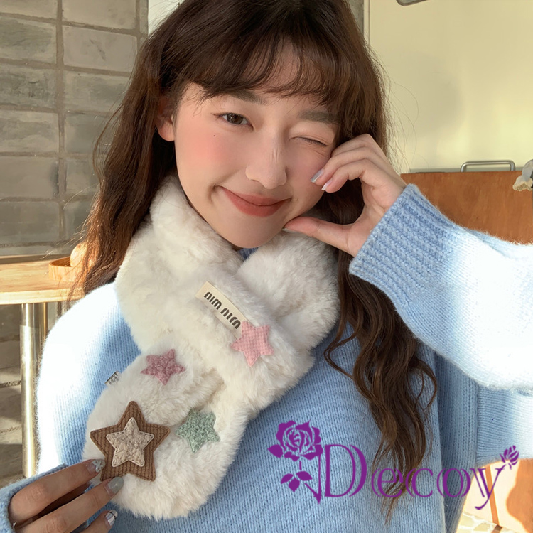 【Decoy】可愛星點 純色仿兔毛交叉脖圍圍巾/白色