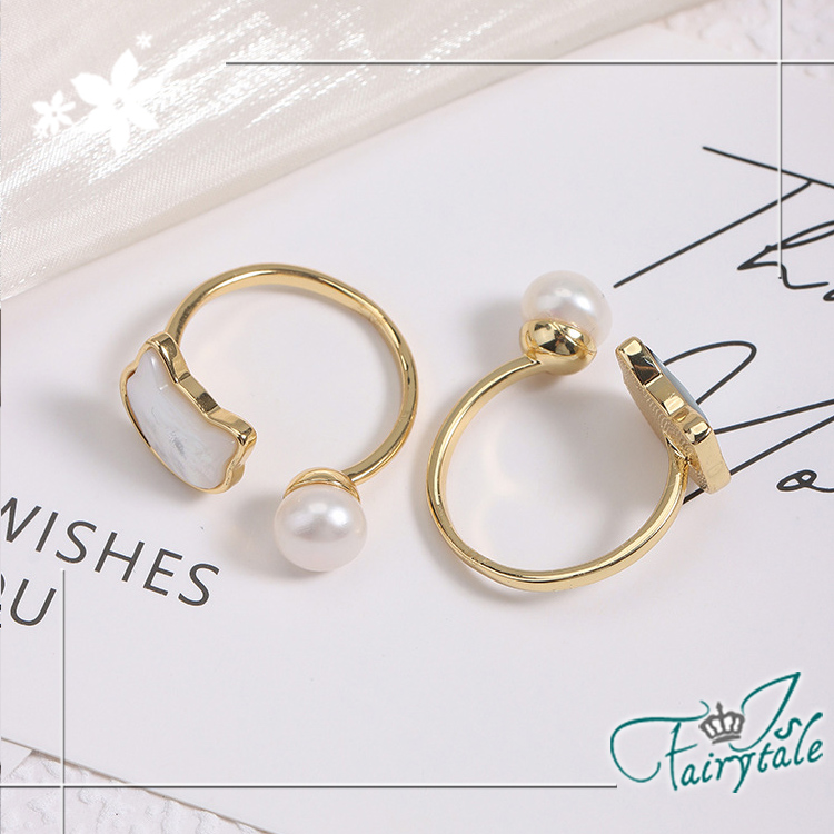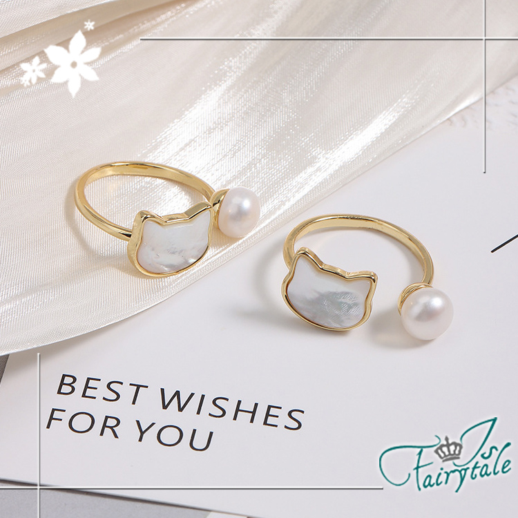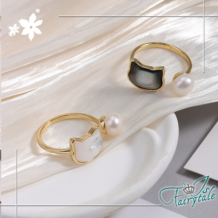 【伊飾童話】極光白貝 萌貓天然珍珠開口彈性戒指/金