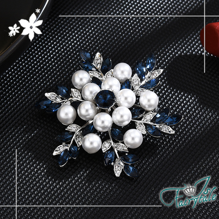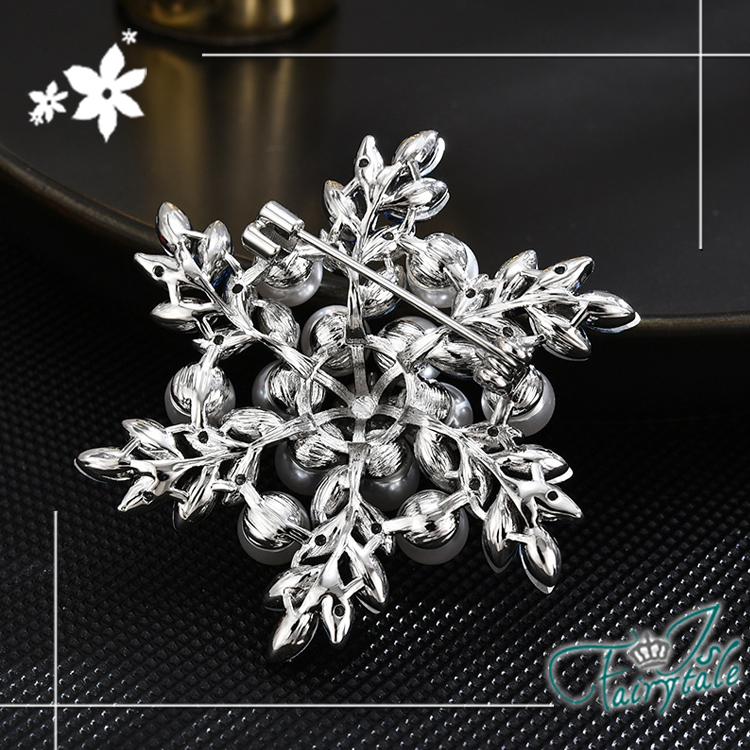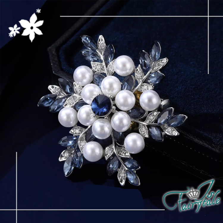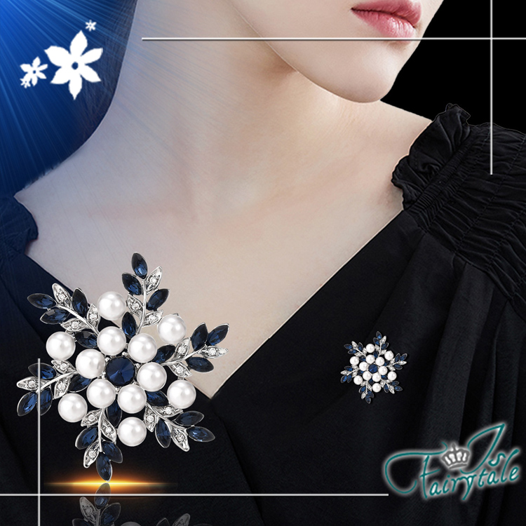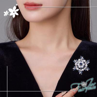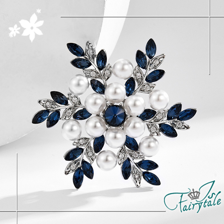 美麗雪花藍鑽造型,水鑽與珍珠點綴閃耀胸針,