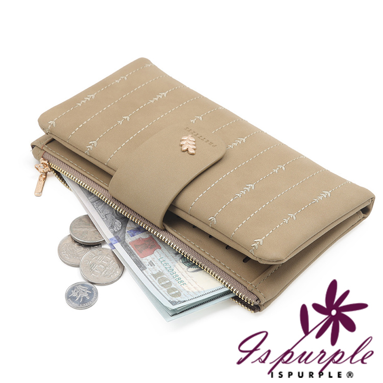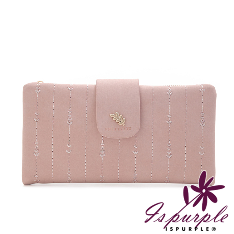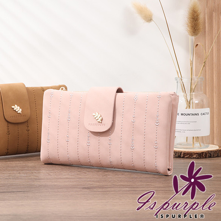 【iSPurple】金葉點綴 輕巧軟皮革二折刺繡長夾/粉色
