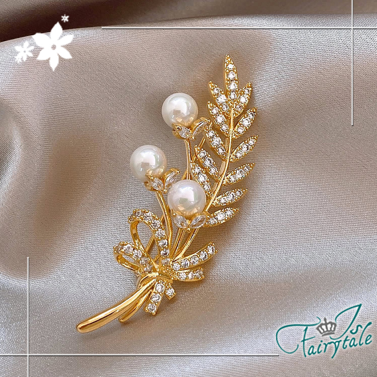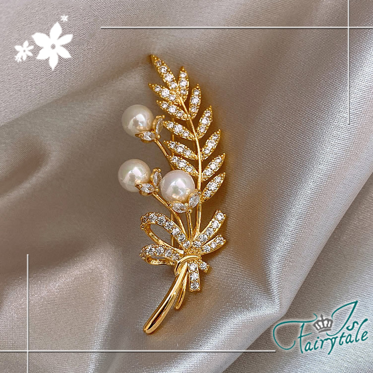 【伊飾童話】珍珠麥穗 金黃田園華麗鋯石胸針/金