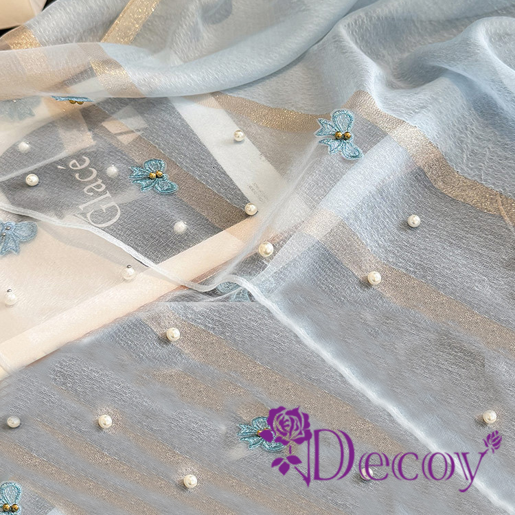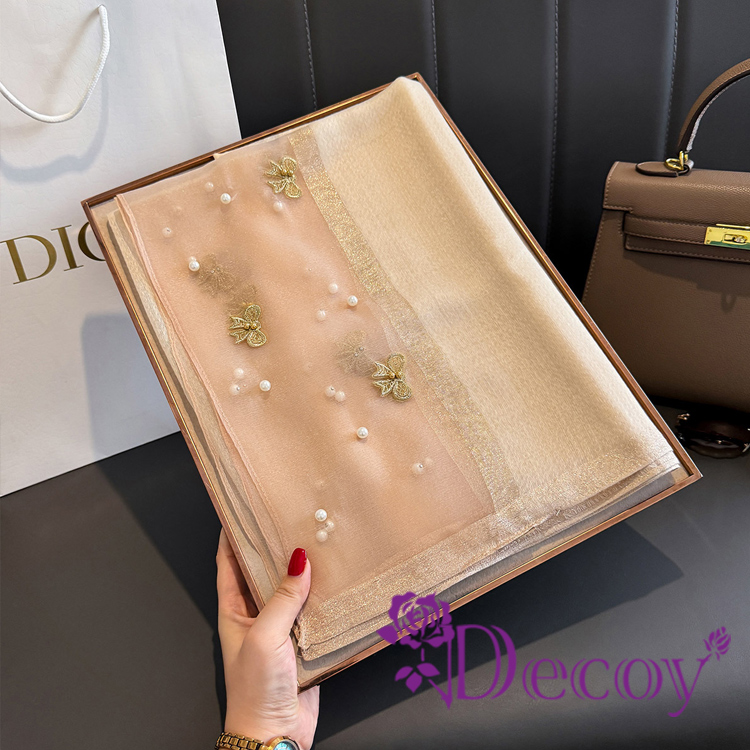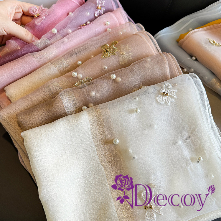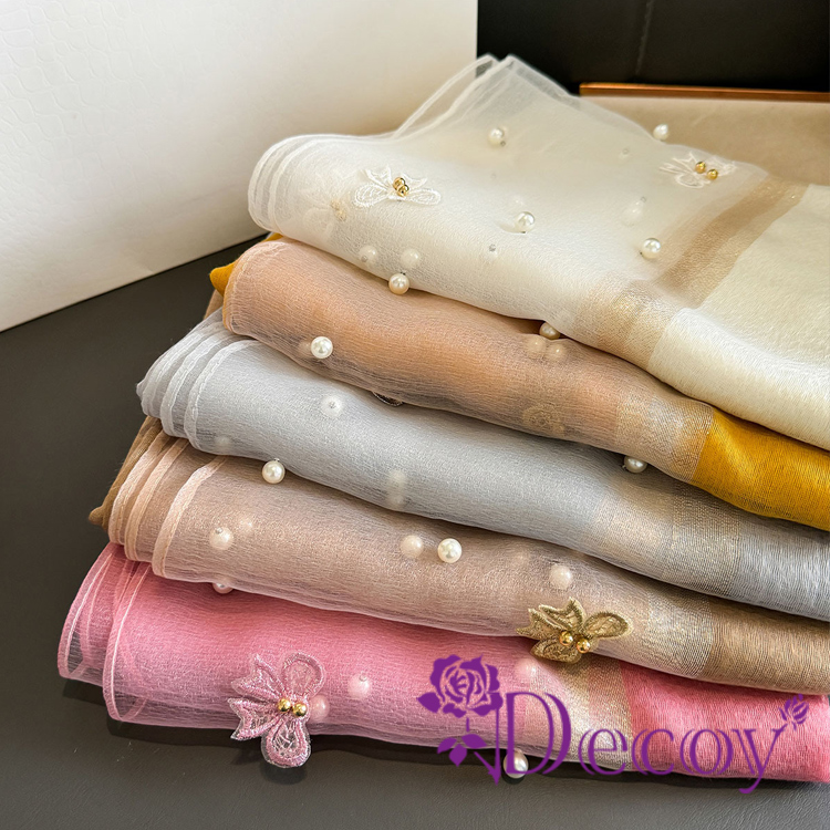 【Decoy】漸層色調 優雅珍珠釘珠薄款披肩圍巾/膚色