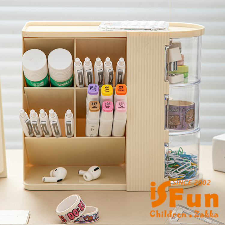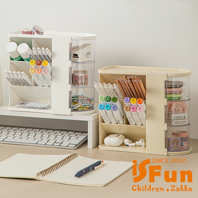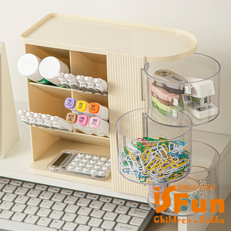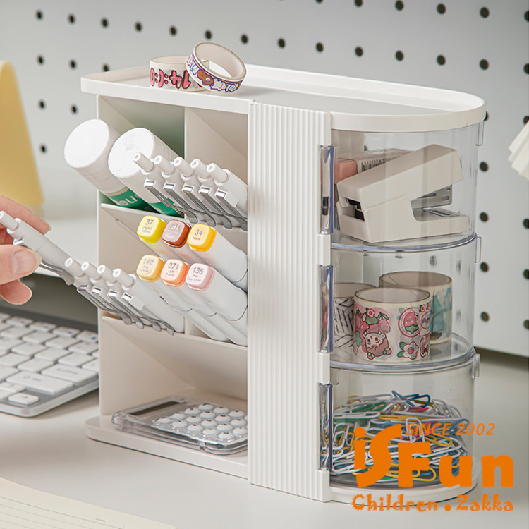 斜插式筆筒結合旋轉收納,時尚設計與實用功能兼具。