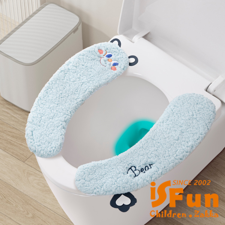 【iSFun】衛浴暖坐 毛絨熊熊加厚魔鬼氈馬桶坐墊2對/藍